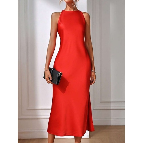 Per donna Abito Midi Abito in Raso Abito da invitata a nozze Elegante Moda Moderno Feste Ospite di nozze Uscire Taglia piccola Semplice Senza Maniche Collo Alto Nero Rosso Marrone Verde Estate