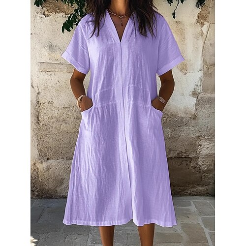 Per donna Nero Blu Verde Estate Primavera Abito Midi Abiti in cotone e lino Abito estivo in cotone Casual Vacanza Quotidiano Vestibilità comoda Semplice Scollo a V
