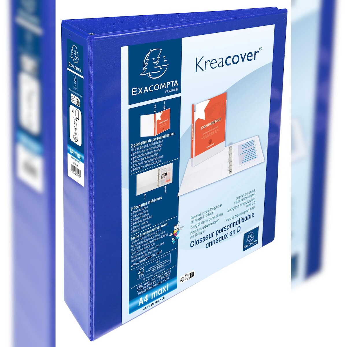 Exacompta 51943BE 10x Ringbuch aus PP 1,9mm, 4 Ringe 40mm, Rücken 64mm, 2 äußere Klarsichthüllen, 32x28,5cm für DIN A4 MAXI - Kreacover - Blau