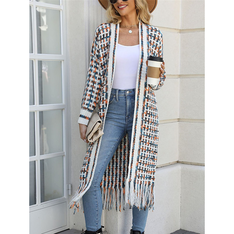 Women's Sweater Cardigan Elegant Fashion Streetwear Plaid Ribbed Open Front Tassel Knitted Long Sleeve Long Tops Knit Outdoor Daily Weekend Black Yellow Spring Fall