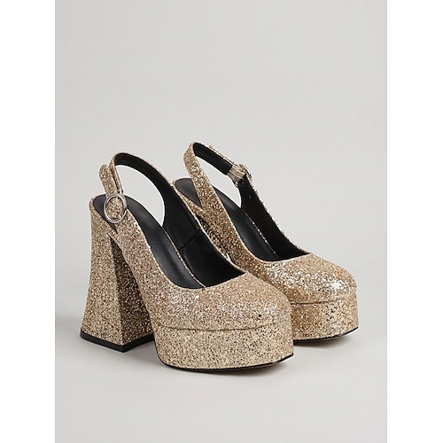 Scarpe con tacco alto e plateau glitterate dorate da donna, décolleté con cinturino alla caviglia per feste, per outfit da discoteca e per la vita notturna