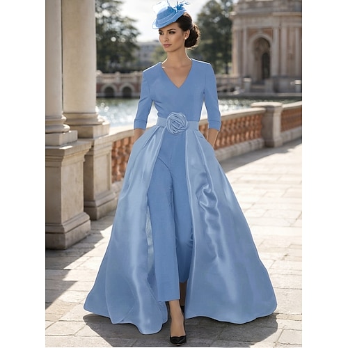 Tute Tubino Colonna Lunghezza al pavimento Abito da cerimonia per signora Manica 3/4 Scollo Illusione Elegante Formale Ospite di nozze Chiffon con Ricamo Tinta unita