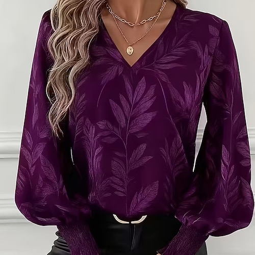 Per donna Blusa Top Eleganti Foglia Semplice Elegante Vintage Signore Manica Lunga Manica a Palloncino Scollo a V Top Regolari Quotidiano Lavoro Ferie Arricciato Patchwork Stampato Blu Vino Viola