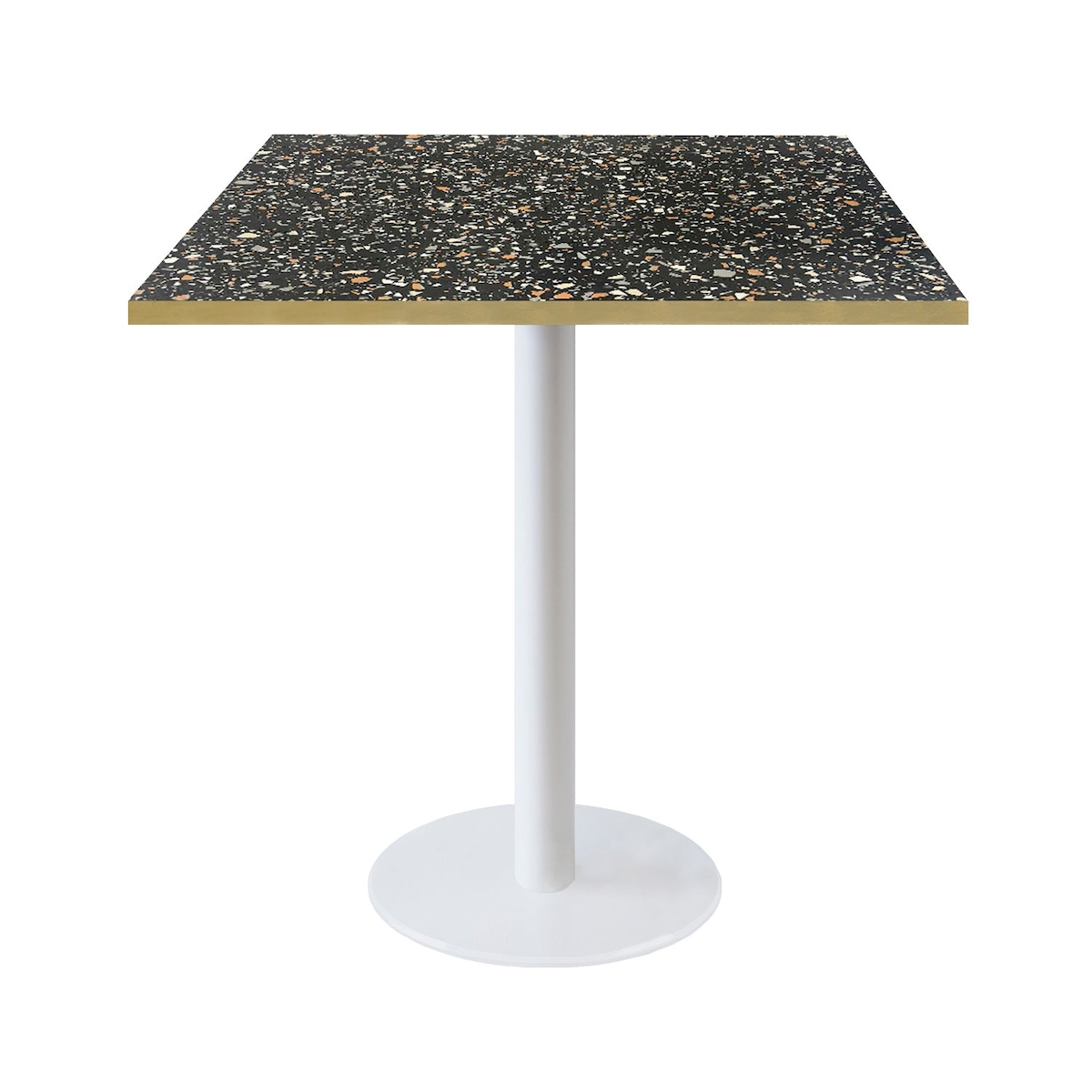 RestooTab - Tisch Rome weiß 70x70 Dekor Terrazzo black chip Kanten messingfarben