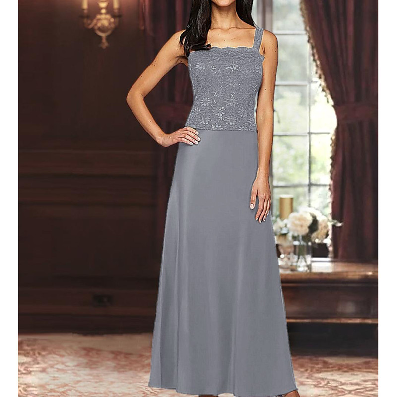 A-Line 3 Piece Floor Length Wedding Guest Dress Mother of the Bride Dress 3/4 Length Sleeve Square Neck Elegant Simple Luxurious Formal Wedding Guest Satin Lace with Lace Sequin