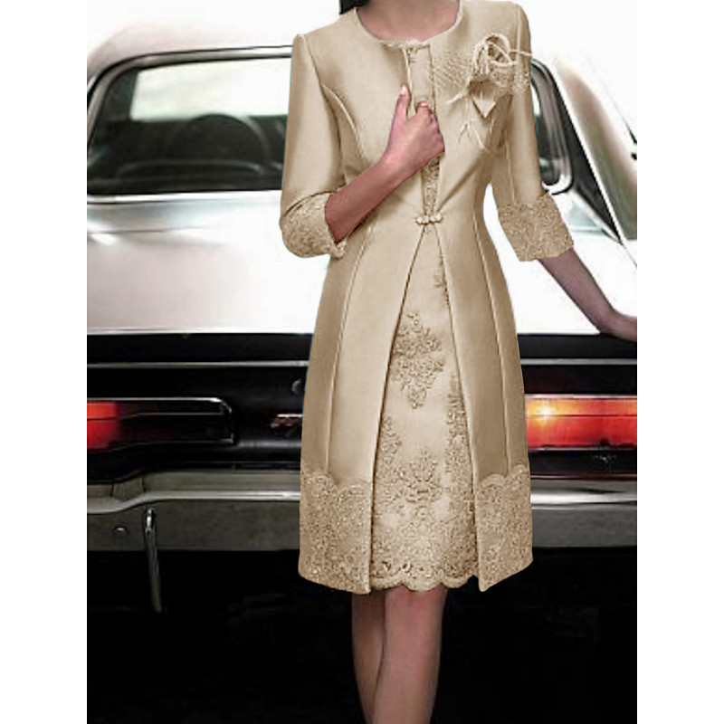 Sheath Column Knee Length Wedding Guest Dress Mother of the Bride Dress 3/4 Length Sleeve Jewel Neck Vintage Plus Size Wedding Guest Satin Lace Jacket Dresses with Appliques