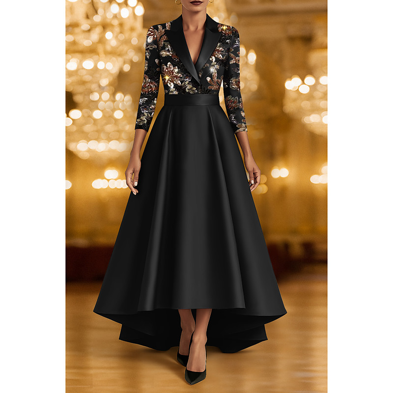 Tuxedo Dress A-Line High-low Dress Flroal Sequin Lace Applique Formal Blazer Dress Wedding Wedding Guest Elegant 3/4 Sleeve Pleated Floor Length Peak Lapels