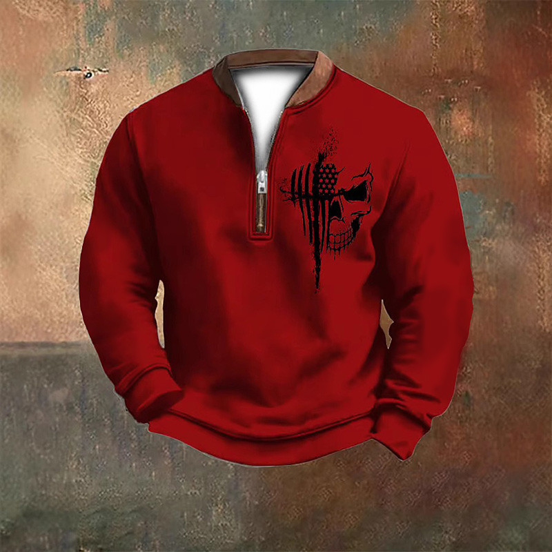 Men's Sweatshirt Quarter Zip Sweatshirt Black White Red Navy Blue Gray Half Zip Color Block Skull American Flag Half Zip Print Daily Sports Outdoor Holiday Polyester Vintage Streetwear Casual Fall
