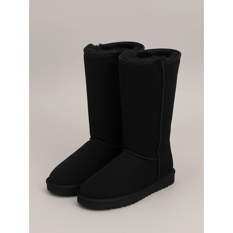 Women's Black Faux Fur Winter Boots with Pom-Pom Laces - Warm Insulated, Knee-High Design, Non-Slip Soles for Cold Weather and Snowy Days
