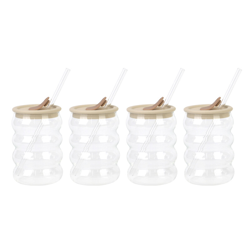 Cloud-Shaped Single Wall Glass Tumbler Set (4-Pack) with Reusable Glass Straws and Silicone Tip/Lid, High Borosilicate