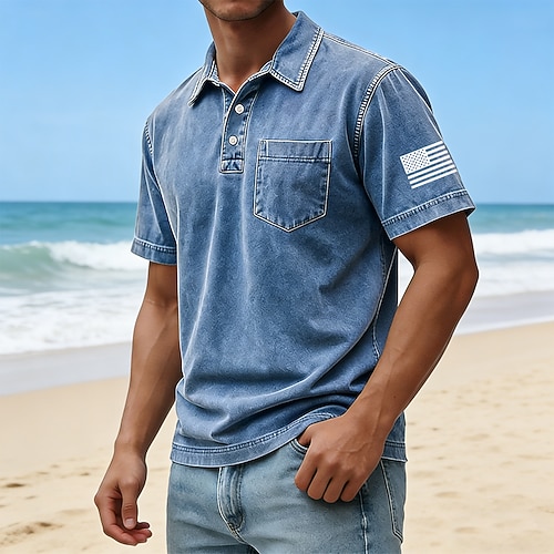 Herren Amerikanische US-Flagge Acid-Wash-Shirt 100% Baumwolle Kurzarm Polo-Shirts Revers Hawaiianisch Lässig Athleisure Urlaubskleidung Tasche 3D-Druck Knöpfe Frühling Sommer Blau Rote Grün