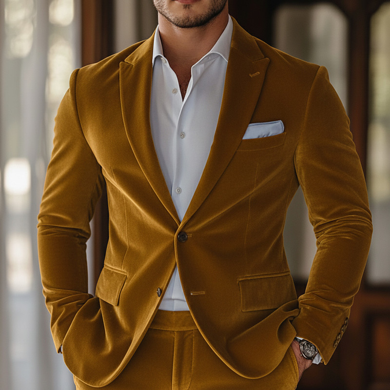 Men's Business Casual Velvet Suit Notch Lapel Black Yellow Daily Business Solid Colored Tailored Fit 2 Piece Single Breasted Two-buttons