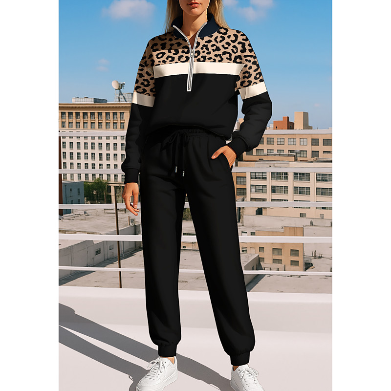 Women's Sweatshirt Tracksuit Sweatsuit Drawstring Zipper Leopard Jacket and Sweatpants Athletic Clothing Set Spring Black with White Casual Workout Outdoor Soft Baggy Long Sleeve Sport Activewear