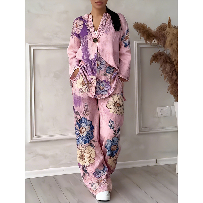 Women's Daily Stylish Two Piece Sets Tracksuit Pants Sets 3/4 Length Sleeve V Neck Floral Graphic Print Casual Daily Pink Spring Fall Regular Fit