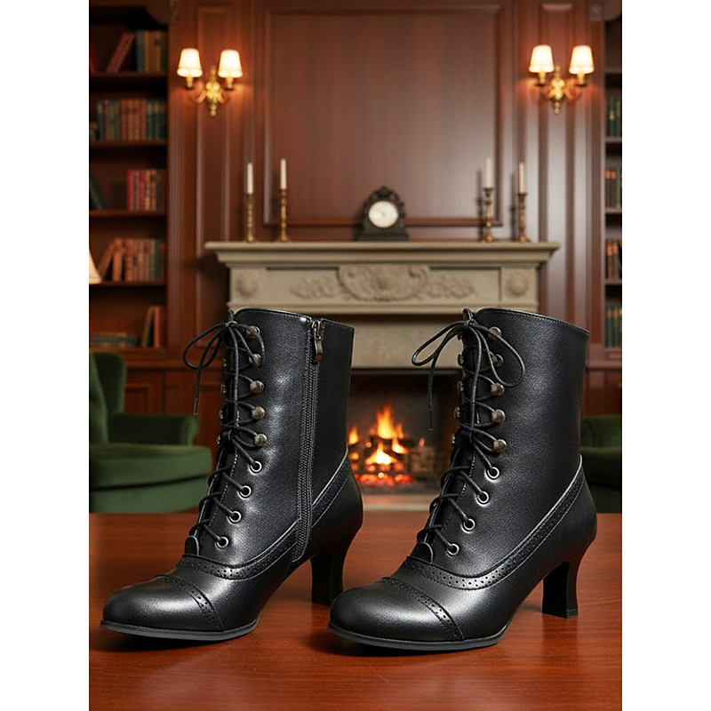 Women's Black Lace-Up Witch Boots with Zipper and Studded Detail, 1920s Vintage-Inspired Chunky Heel Design, Perfect for Party, Evening Wear, and Special Occasions