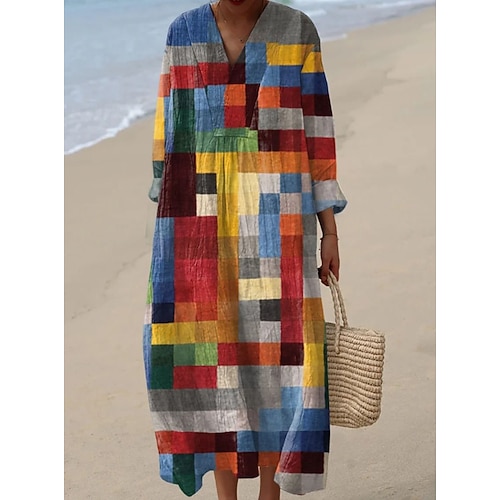 Per donna Abito maxi Vestito Estivo Abito Estivo Vacanza Casual Boho Quotidiano Vestibilità comoda Grafico Blocco di colori Etnico Manica Lunga Scollo a V Rosa Arancione Verde Arancione chiaro Estate