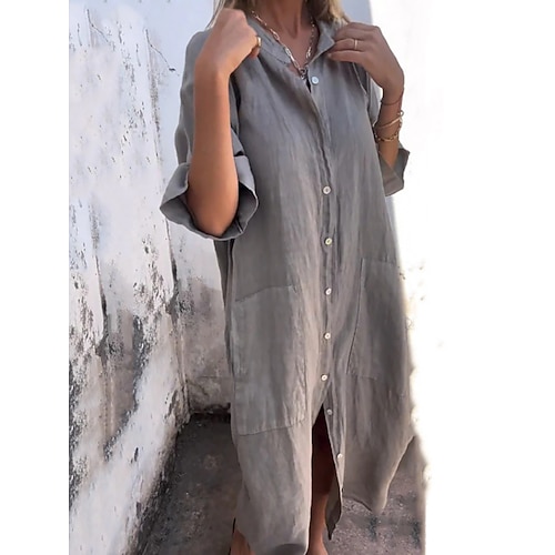 Per donna Abito Midi Abiti in cotone e lino Abito Camicia Vestito Casual Elegante Moda Moderno Quotidiano All'aperto Vacanza Vestibilità comoda Semplice Mezza Manica Colletto a Camicia Blu Nero Rosso