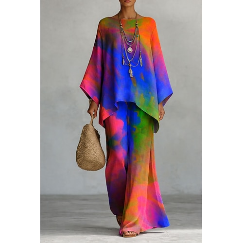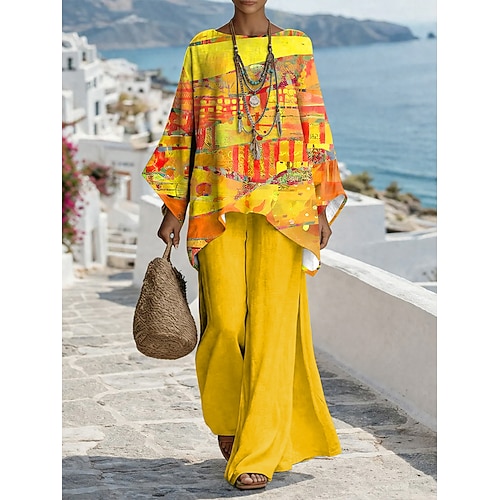 Per donna Set di Pantaloni Manica 3/4 Girocollo Grafico Geometrico Stampato Moda Streetwear Casuale Quotidiano All'aperto Blu Giallo Arancione Estate Vestibilità comoda