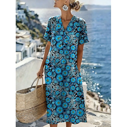 Per donna Abito Midi Abito a Tubino Vestito Estivo Vacanza Casual Spiaggia Vestibilità comoda Floreale Grafico Manica Corta Scollo a V Blu Rosa Rosso Viola Estate Primavera