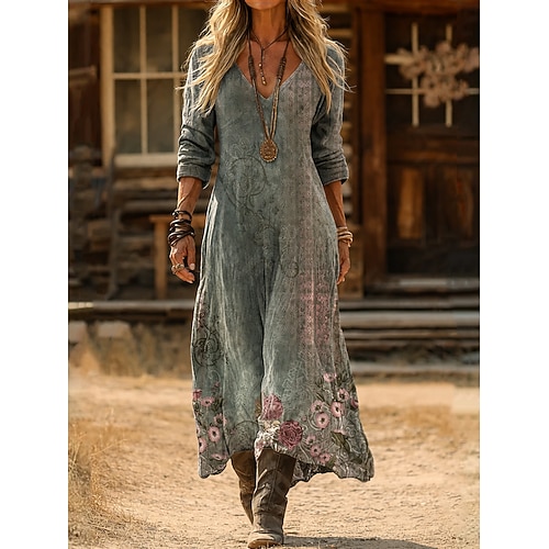 Per donna Abito maxi Abito a trapezio Vacanza Casual Quotidiano Ferie Vestibilità comoda Floreale Grafico Manica Lunga Scollo a V Blu Arancione Estate Primavera