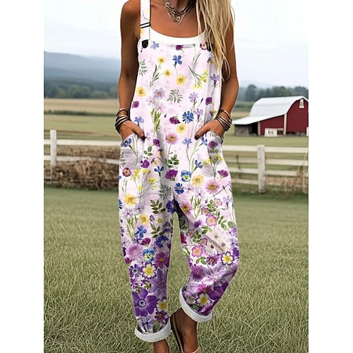 Per donna Tuta Attivo Floreale Senza Maniche Senza maniche Collo quadrato Tasca Stampato Quotidiano Vacanza Vestibilità comoda Bianco Verde chiaro Viola Estate