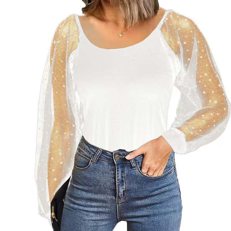Women's Blouse Plain Stylish Sexy Long Sleeve Crew Neck Regular Tops Daily Holiday Going out Patchwork Mesh Black White Summer Spring