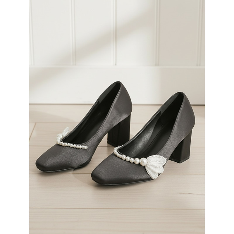 Women's Elegant Block Heels with Pearl Decoration – Square Toe, Vintage Style, Comfortable Pumps for Weddings, Parties and Formal Occasions