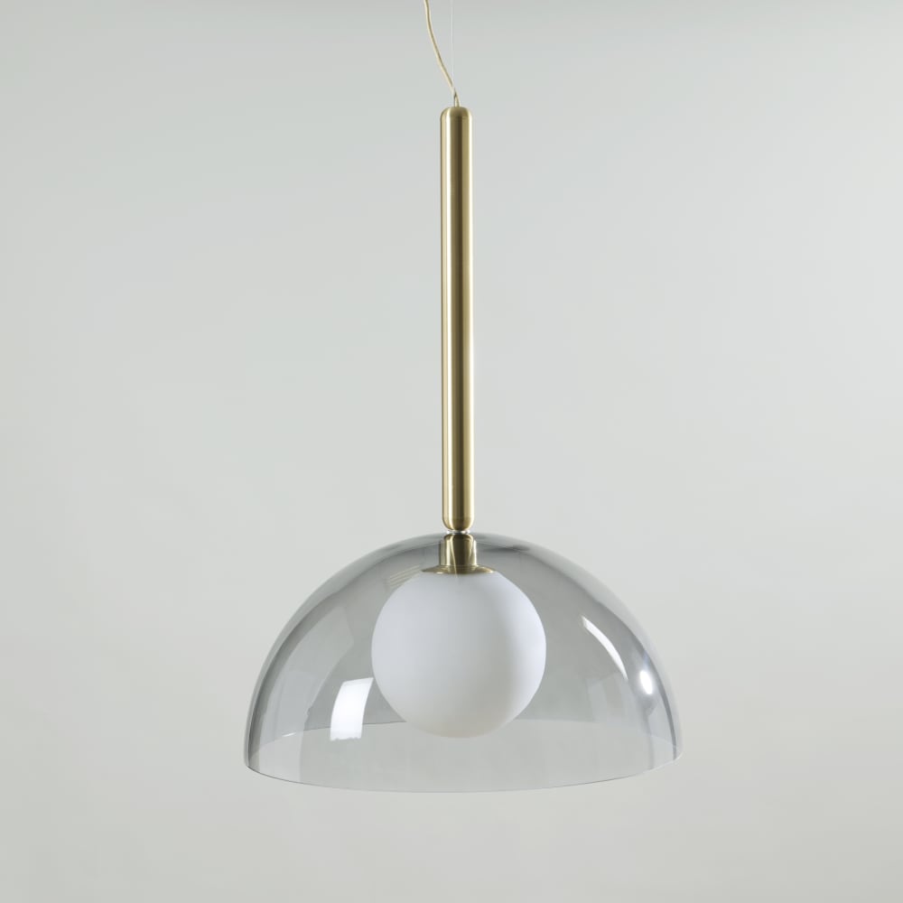 Lampada a sospensione a campana in vetro fumé con asta in acciaio dorato