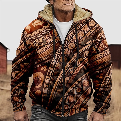 Per uomo Grafico Felpa con Cappuccio Giacca di pelle Moda Etnico Casual Manica Lunga Con Cappuccio All'aperto Sport all'Aperto Uscire Marrone chiaro Bianco Arancione Marrone Tasca Stampato Pile