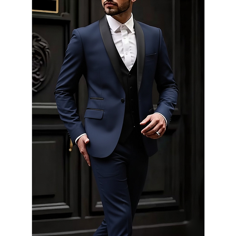 Men's Wedding Casual Party Suits Shawl Lapel Dark Blue Formal Solid Colored Slim Fit 3 Piece Single Breasted One-button