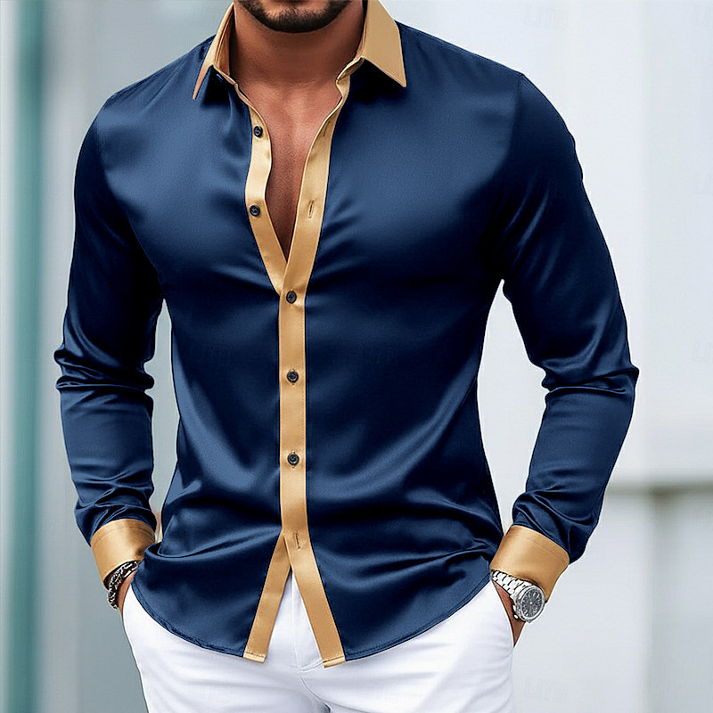 Men's Shirt Satin Shirt Dress Shirt Casual Shirt Button Up Shirt Prom Shirt Plain Wedding Formal Black Wine Navy Blue Royal Blue Long Sleeve Lapel All Seasons Clothing Apparel Patchwork