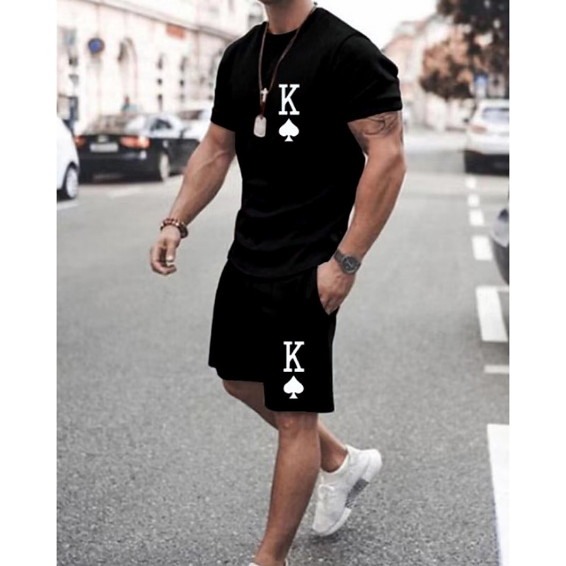 Men's T-shirt Suits 2 Pieces Outfits Tee Shorts Short Sleeve Crew Neck Summer Heart Quotes Sayings Fashion Casual 2 Piece Vacation Daily Wear Going out GreenLime Black White Top Tee for Men