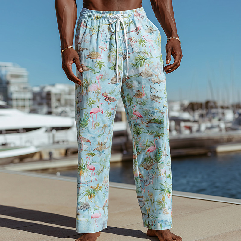 Men's Flamingo Coconut Tree Tropical Plants Trousers Baggy Pants Casual Pants Mid Waist Hawaiian Outdoor Vacation Beach Wear Elastic Drawstring Waist Linen-Like Pants with Pockets Summer Spring 3D