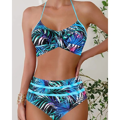 Tankini da donna 2 pezzi costume da bagno arricciato palma alta vita senza schiena vacanza beach wear floreale grafica scollo a U senza maniche
