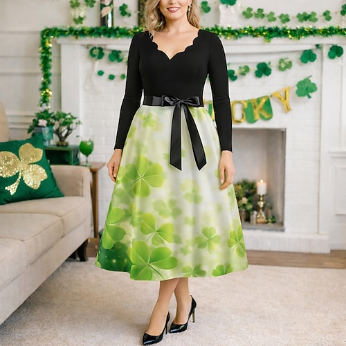 San Patrizio 2026 Anni 1950 Retrò Vintage Lunghezza al ginocchio Vestito Abito a Linea Abito da tè Lunghe Costume Per donna Giorno di San Patrizio Feste Festival Adolescente Adulti Vestito Abiti per