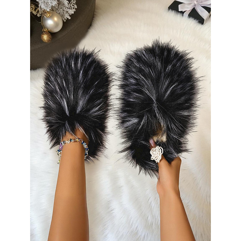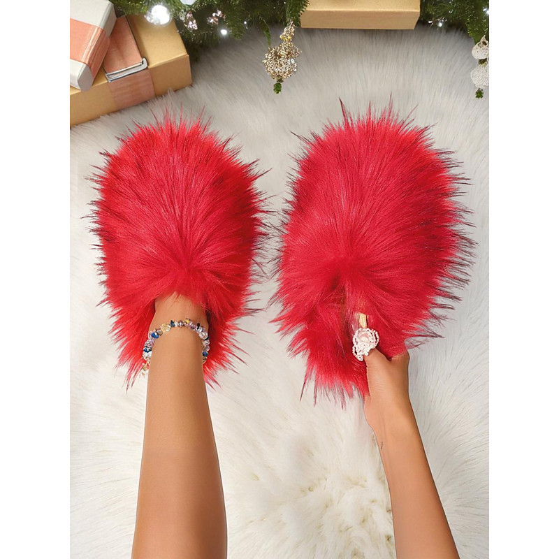 Women's Red Furry Slippers, Plush Fur Slip-On House Slippers, Comfortable Footwear for Lounging at Home, Christmas and Relaxing