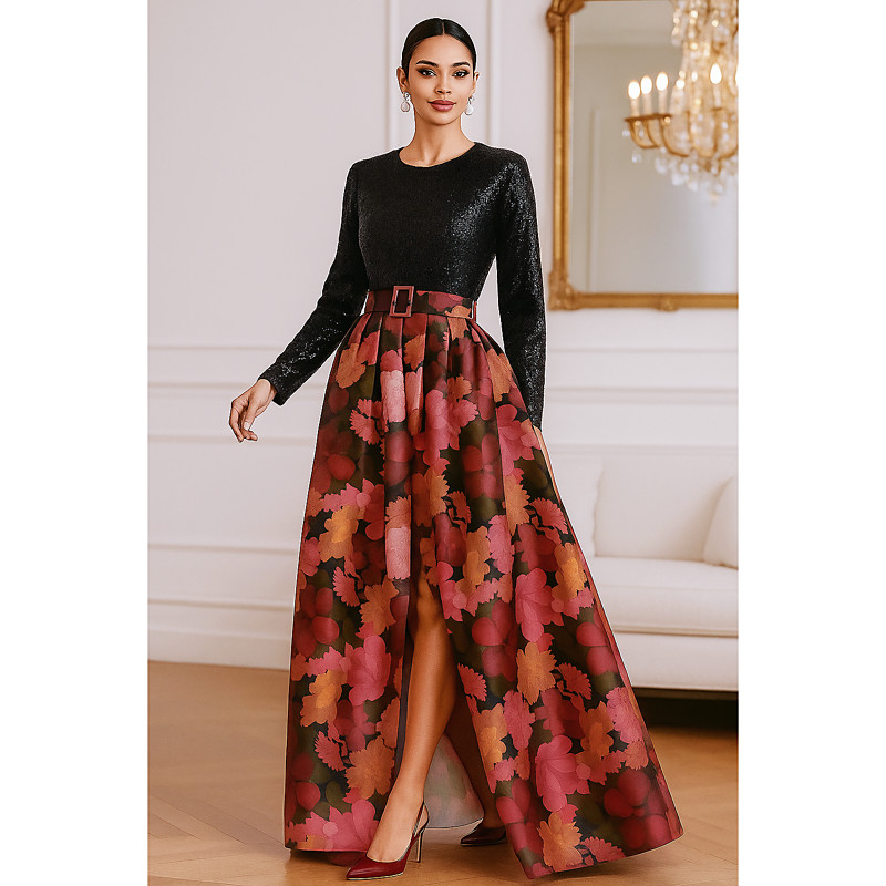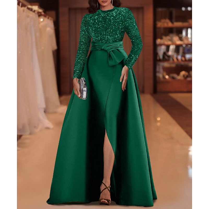 A-Line Floor Length Evening Gown Ball Gown Elegant Long Sleeve Crew Neck Wedding Formal Pocket Nylon Sequined with Floral Print Sequin Slit