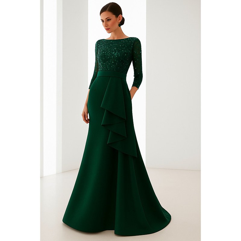 Mermaid Trumpet Floor Length Prom Dresses Evening Gown Ball Gown Formal Dress Elegant Silky Long Sleeve Boat Neck Wedding Formal Champagne Mother Of the Bride Dress Satin Sequined with Glitter Ruffles