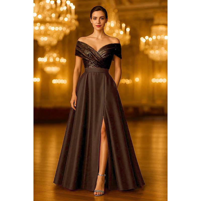A-Line Floor Length Evening Gown Ball Gown Formal Dress Elegant Silky Sleeveless Off Shoulder Wedding Formal Pocket Satin Sequined with Pleats Slit