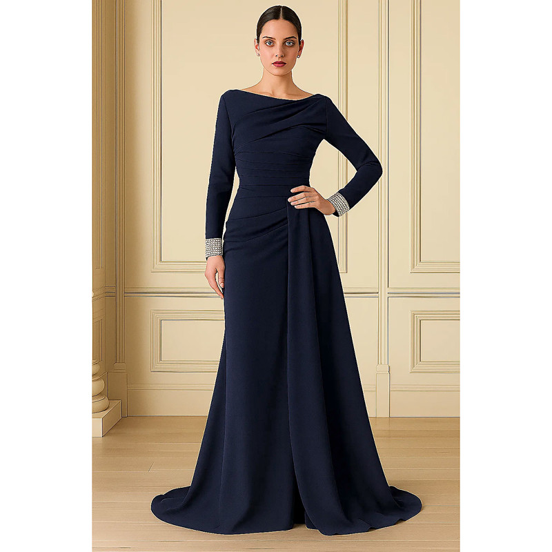 Mermaid Trumpet Sweep Brush Train Evening Gown Ball Gown with Overskirt Formal Dress Elegant Celebrity Style Long Sleeve Boat Neck Garden Party Wedding Stretch Crepe with Pleats