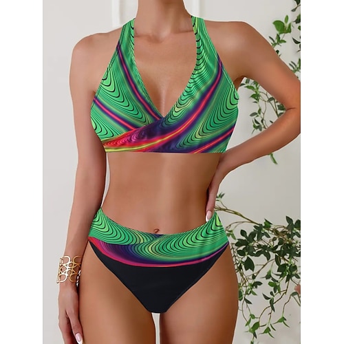 Costume da bagno bikini da donna 2 pezzi alla moda snellente senza schienale abbigliamento da spiaggia per le vacanze geometrico a blocchi di colore scollo a V senza maniche