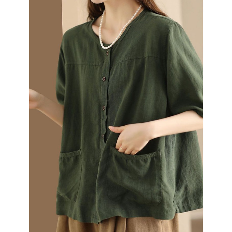 Women's Blouse Plain Stylish Casual Half Sleeve Crew Neck Regular Tops Daily Pocket Buttons Black White Pink Green Khaki Summer Spring