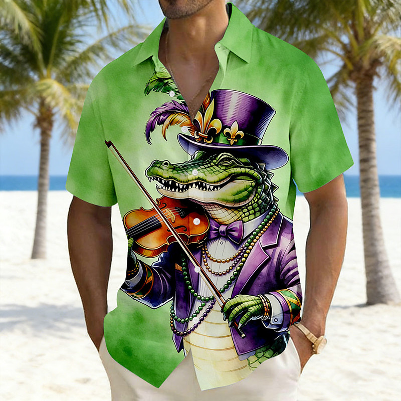 Mardi Gras Men's Crocodile Beads Mardi Gras Fleur De Lis Shirt Summer Shirt Button Up Shirt Short Sleeve Vintage Retro Holiday Summer Turndown 3D Print Linen Like Shirt Blue Purple Green
