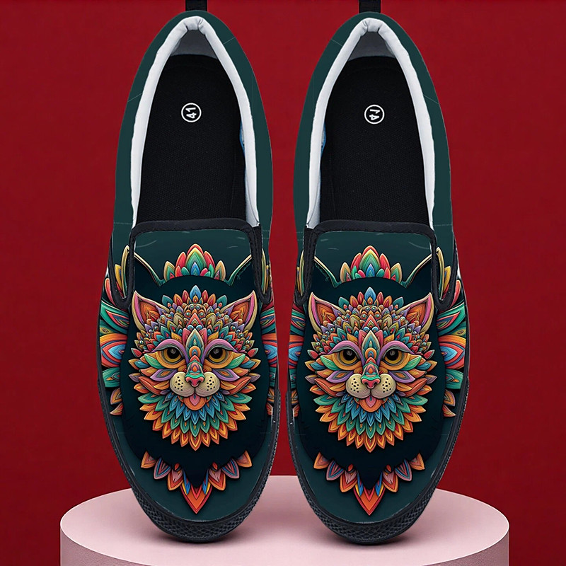 Men's Mardi Gras Mandala Cat Print Slip-On Shoes – Fun and Colorful Design for Carnival, Parades and Artistic Celebrations