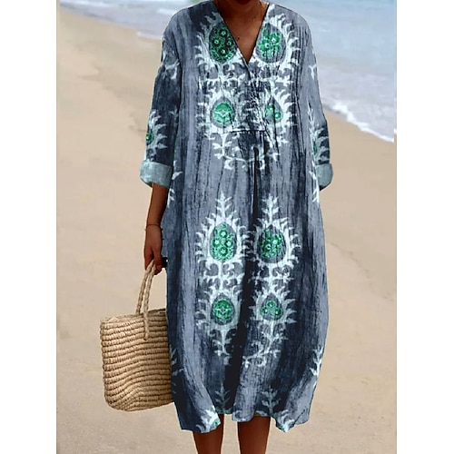 Per donna Abito Midi Vestito Estivo Abito a trapezio Vacanza Casual Boho Feste Ferie Spiaggia Vestibilità comoda Floreale Grafico Manica Lunga Scollo a V Verde salvia Blu turchese Marrone Estate