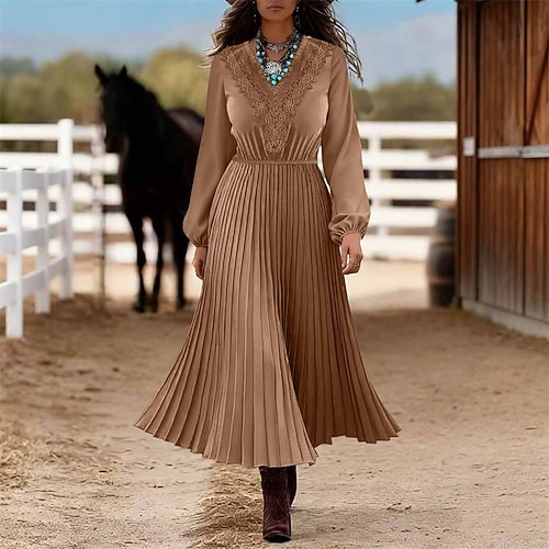 Per donna Abito Midi Abito in Pizzo Tubino Vestito a ruota Elegante Vintage Moda All'aperto Ufficio Vacanza Vestibilità regolare Semplice Manica Lunga Scollo a V Blu Vino Verde Cachi Estate Primavera