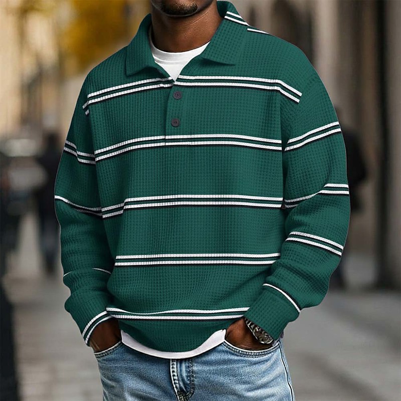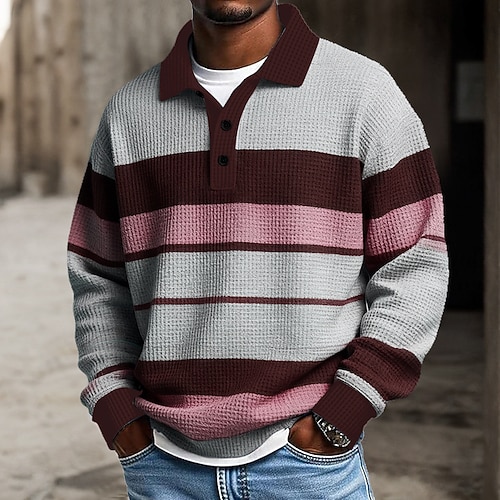 Men's Horizontal Stripes Waffle Polo Shirts Rugby Polo Long Sleeve Polo Shirts Lapel Sportswear Casual School Athleisure Daily Wear 3D Print Spring Fall Winter Blue Brown Green