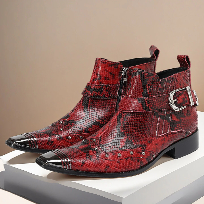 Men's Red Snake-Patterned Leather Boots with Metal Toe Cap – Fashionable and Distinctive, Ideal for Bold Looks and Evening Wear