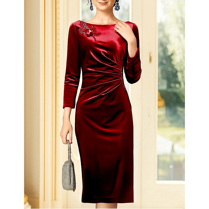 Sheath Column Tea Length Party Dress Cocktail Dress Wedding Guest Dress Mother of the Bride Dress Long Sleeve Crew Neck Elegant Vintage Party Spandex with Beading