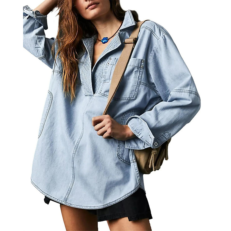 Women's Shirt Dressy Tops Solid Color Plain Elegant Vintage Ladies Long Sleeve Shirt Collar Regular Tops Work Daily Holiday Patchwork Pocket Royal Blue Blue Sky Blue Purple Brown Fall Winter